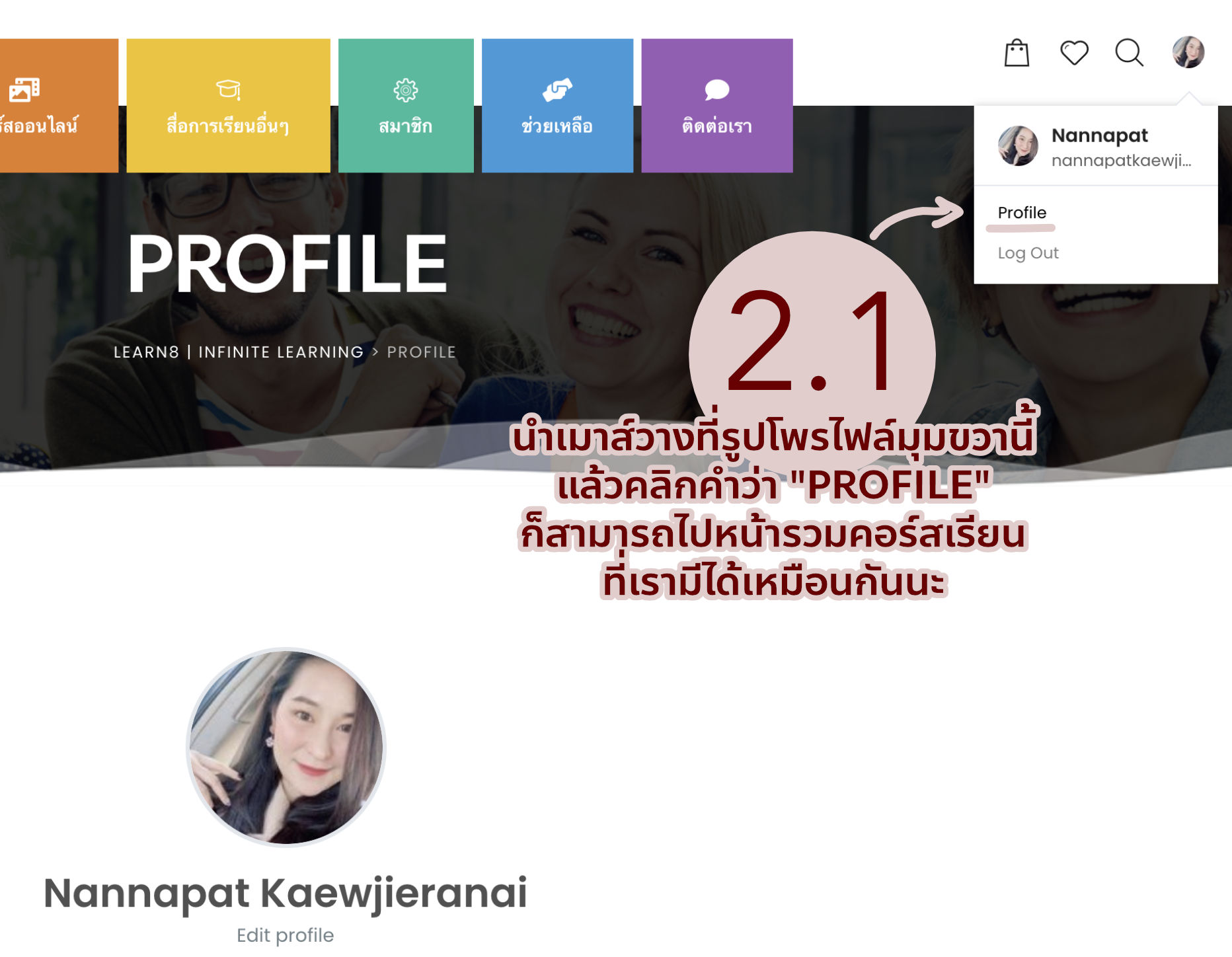 2.1 เอาเมาส์วางที่รูปโพรไฟล์มุมขวาบน แล้วคลิก "PROFILE" ก็ได้เหมือนกัน